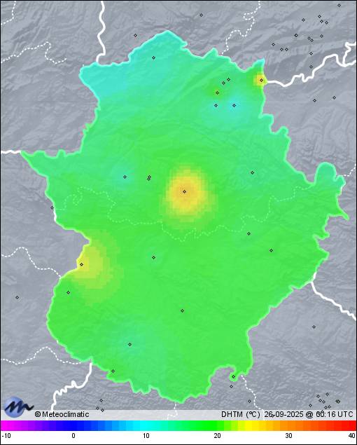| 25-09-2025 | | | Máx. | Mín. | | | Temperatura | 30,0 | 9,8 | °C | | Humedad | 47 | 25 | % | | Viento | 7 | n/a | km/h | | Presión | 1.015 | 1.012 | hPa | | Precipitación | 0,0 | mm |