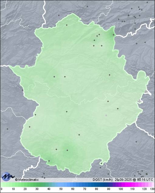 | 28-09-2025 | | | Máx. | Mín. | | | Temperatura | 19,4 | 17,1 | °C | | Humedad | 99 | 88 | % | | Viento | 31 | n/a | km/h | | Presión | 1.014 | 1.009 | hPa | | Precipitación | 0,0 | mm |
