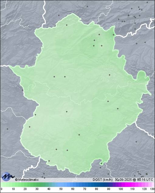 | 29-09-2025 | | | Máx. | Mín. | | | Temperatura | 22,0 | 14,0 | °C | | Humedad | 99 | 66 | % | | Viento | 32 | n/a | km/h | | Presión | 1.019 | 1.015 | hPa | | Precipitación | 0,0 | mm |