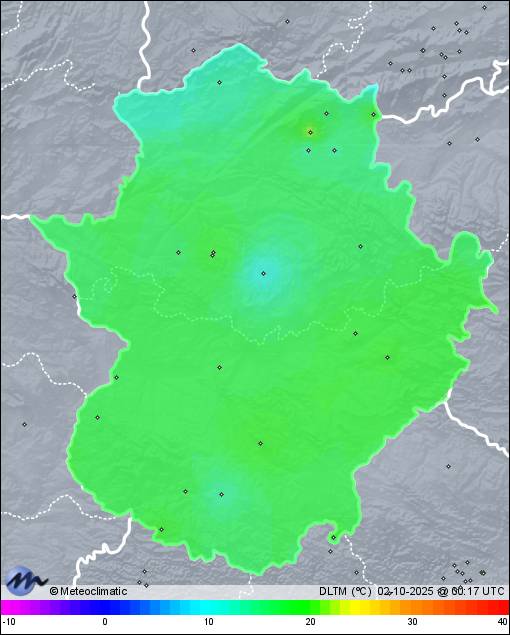 | 01-10-2025 | | | Máx. | Mín. | | | Temperatura | 29,2 | 9,9 | °C | | Humedad | 93 | 35 | % | | Viento | 17 | n/a | km/h | | Presión | 1.022 | 1.018 | hPa | | Precipitación | 0,0 | mm |