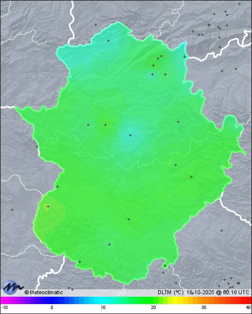 15-10-2025 | | Máx. | Mín. | | Temperatura | 30,0 | 10,5 | °C | Humedad | 96 | 25 | % | Viento | 30 | n/a | km/h | Presión | 1.019 | 1.014 | hPa | Precipitación | 0,0 | mm |