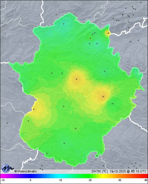 18-10-2025 | | Máx. | Mín. | | Temperatura | 29,5 | 11,2 | °C | Humedad | 90 | 31 | % | Viento | 24 | n/a | km/h | Presión | 1.020 | 1.015 | hPa | Precipitación | 0,0 | mm |