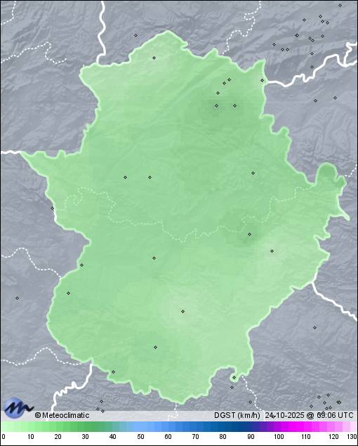 | Cáceres Norte | 395 | 17,4 | 18,0 | 17,3 | 97 | 98 | 83 | 1.017 | 1.018 | 1.016 | 2 ESE | 13 | - | 589,0 | |