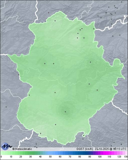 | 26-10-2025 | | | Máx. | Mín. | | | Temperatura | 20,2 | 11,0 | °C | | Humedad | 97 | 59 | % | | Viento | 30 | n/a | km/h | | Presión | 1.021 | 1.013 | hPa | | Precipitación | 4,5 | mm |