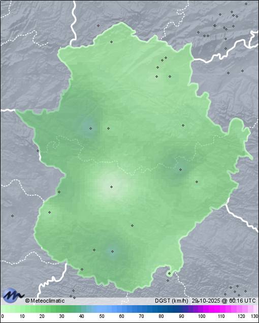 | Actualizado: 19:43 UTC | 13,4°C 90% | 19,2 °C / 96% | | 3,5°C / 54% | | 5 km/h SSE | | 17 km/h | | 1.015 hPa | | 0,2 mm |