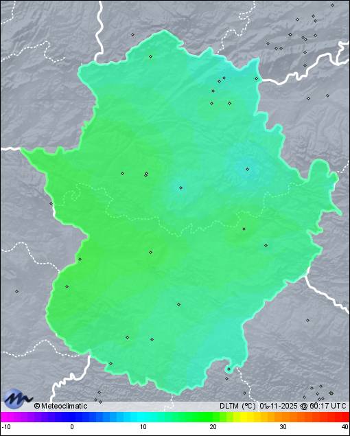 | Act. | Máx. | Mín.  | Act. | Máx. | Mín. | Act. | Máx. | Mín. | Act. | Máx. | Hoy | Año |  |  | Guijo de Santa Bárbara | 910 | 11,9 | 12,5 | 10,8 | 99 | 99 | 92 | 1.019 | 1.021 | 1.018 | 1 W | 15 | x | x |  |  |  | Navezuelas | 900 | 12,3 | 14,8 | 11,2 | 90 | 90 | 76 | 1.016 | 1.017 | 1.015 | 6 NNE | 18 | - | 613,3 |  |  |  | Aldeanueva de la Vera | 667 | 12,8 | 13,9 | 11,9 | 95 | 95 | 85 | 1.018 | 1.018 | 1.017 | - | 11 | 11,8 | 1.216,6 |  |  |  | Talayuela | 260 | 15,0 | 17,9 | 12,2 | 99 | 99 | 81 | 1.015 | 1.017 | 1.014 | 6 N | 17 | 1,0 | 631,7 |  |  |  | Madrigal de la Vera | 401 | 14,8 | 15,8 | 12,7 | 91 | 91 | 84 | 1.017 | 1.018 | 1.016 | - | 21 | 2,2 | 947,2 |  |  |  | Plasenzuela | 427 | 16,4 | 19,8 | 13,1 | 78 | 89 | 61 | 1.014 | 1.015 | 1.013 | x | x | - | 118,2 |  |  |  | Sierra de Fuentes | 410 | 17,3 | 19,7 | 13,5 | 77 | 90 | 59 | 1.016 | 1.018 | 1.015 | 17 SSW | 48 | - | 50,0 |  |  |  | Jaraíz de la Vera | 565 | 13,8 | 13,8 | 13,8 | 99 | 99 | 99 | 1.014 | 1.015 | 1.014 | 1 WNW | 4 | 0,5 | 1.464,3 |  |  |  | Cáceres Norte | 395 | 17,4 | 19,8 | 14,0 | 87 | 97 | 70 | 1.015 | 1.016 | 1.014 | 6 S | 26 | - | 640,0 |  |  |  | Arroyo de la Luz | 339 | 17,4 | 20,0 | 14,3 | 87 | 93 | 69 | 1.017 | 1.018 | 1.015 | 15 S | 35 | - | 465,0 |  |  |  | Pinofranqueado | 449 | 14,7 | 14,7 | 14,6 | 95 | 95 | 95 | 1.014 | 1.014 | 1.014 | 7 SSW | 19 | 0,2 | 1.086,0 |  |  |  | Jaraíz - Vegas del Tiétar | 235 | 15,6 | 15,7 | 15,6 | 96 | 96 | 95 | 1.015 | 1.016 | 1.015 | 1 E | 11 | - | 748,3 |  |  |  | Cáceres - IES Javier G.T. | 456 | 17,1 | 17,3 | 17,1 | 82 | 82 | 80 | 1.014 | 1.014 | 1.014 | x | x | x | x |  |