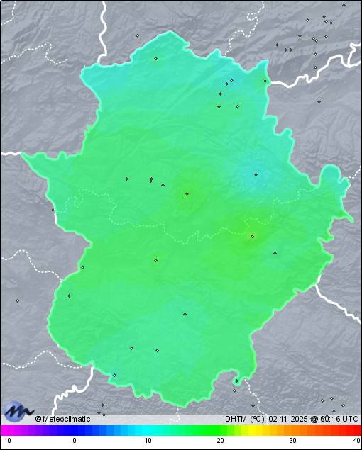 | Cáceres Norte | 395 | 16,5 | 19,7 | 15,7 | 95 | 98 | 76 | 1.021 | 1.021 | 1.015 | 5 WNW | 22 | 0,3 | 640,3 | |