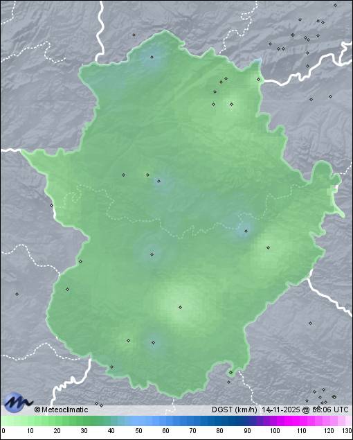 | Actualizado: 06:30 UTC | 11,7°C 90% | 13,5 °C / 90% | | 11,4°C / 80% | | 10 km/h S | | 45 km/h | | 1.009 hPa | | 8,6 mm |