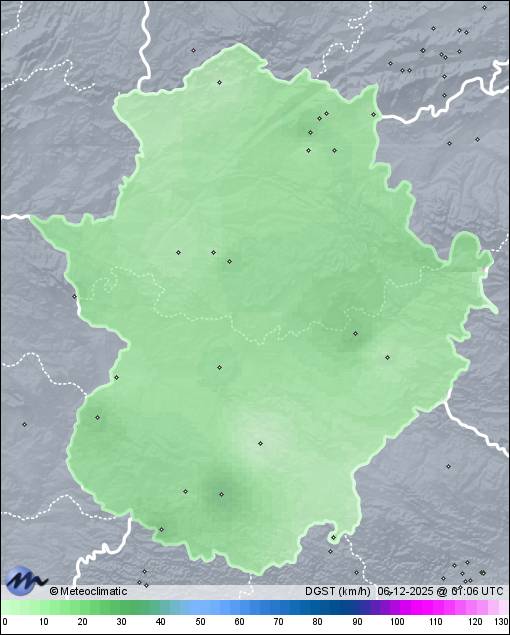 | Actualizado: 00:05 UTC | 9,5°C 80% | 10,7 °C / 85% | | 9,1°C / 75% | | 4 km/h SE | | 35 km/h | | 1.017 hPa |