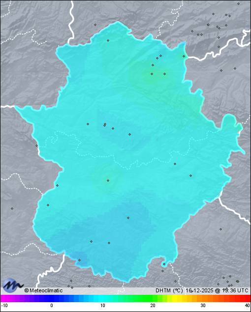 | Actualizado: 11:05 UTC | 4,6°C 95% | 5,9 °C / 97% | | 3,9°C / 88% | | 4 km/h ENE | | 22 km/h | | 1.006 hPa | | 6,9 mm |