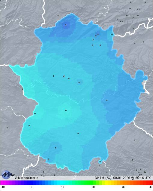 | 08-01-2026 | | | Máx. | Mín. | | | Temperatura | 10,0 | 7,1 | °C | | Humedad | 94 | 87 | % | | Viento | 16 | n/a | km/h | | Presión | 1.034 | 1.030 | hPa | | Precipitación | 0,0 | mm |