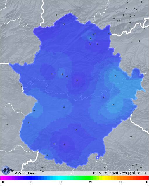 | Actualizado: 00:21 UTC | -2,1°C 75% | -1,9 °C / 75% |  | | -2,7°C / 74% | | Calma | | 2 km/h | | 1.026 hPa |