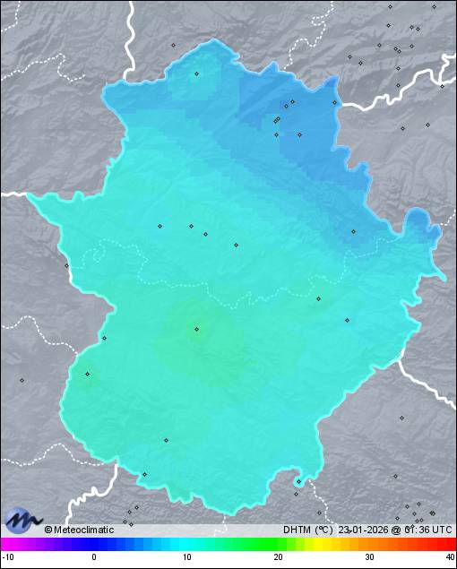 | Actualizado: 00:21 UTC | 3,1°C 69% | 3,4 °C / 69% |  | | 2,6°C / 65% | | 5 km/h N | | 24 km/h | | 1.006 hPa |