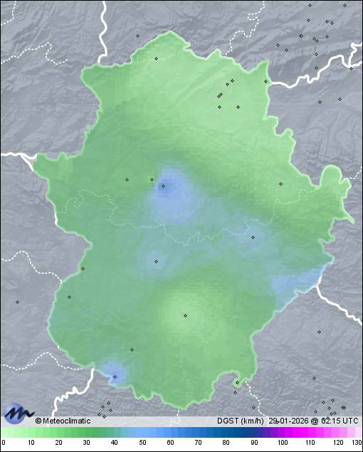 | Actualizado: 00:30 UTC | 10,9°C 90% | 12,7 °C / 90% | | 6,1°C / 65% | | 6 km/h SSE | | 49 km/h | | 1.007 hPa | | 0,4 mm |