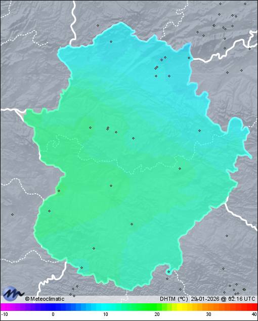 | Actualizado: 00:43 UTC | 4,2°C 92% | 4,2 °C / 94% | | 2,7°C / 91% | | 6 km/h ENE | | 13 km/h | | 1.004 hPa |
