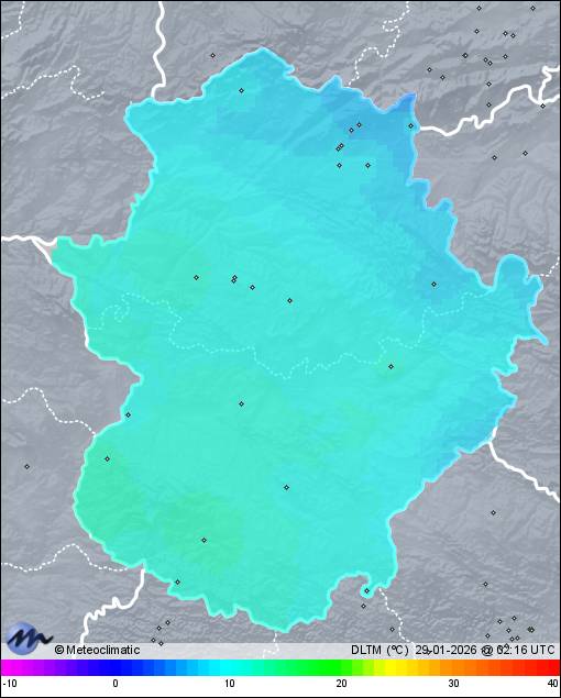 | Actualizado: 00:43 UTC | 4,2°C 92% | 4,2 °C / 94% | | 2,7°C / 91% | | 6 km/h ENE | | 13 km/h | | 1.004 hPa |