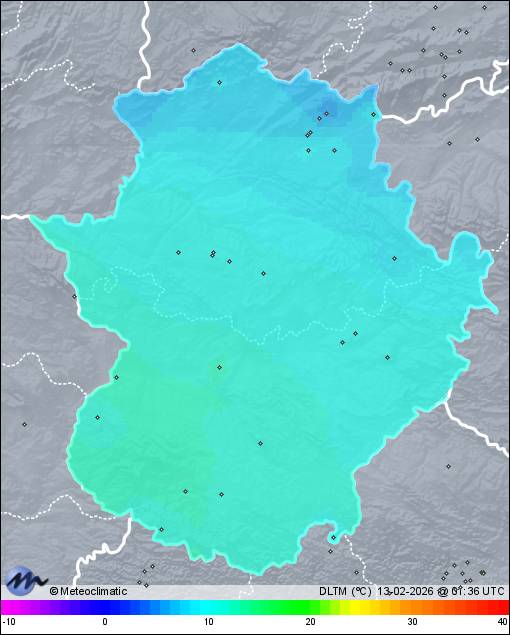 | Valverde de Burguillos | 420 | 13,5 | 13,5 | 13,4 | 97 | 97 | 96 | 1.004 | 1.004 | 1.004 | 15 SSE | 22 | - | 299,4 | |