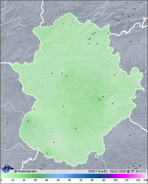 | Actualizado:24-02-2026 23:58 UTC | 9,7°C 85% | 25,6 °C / 95% | | 5,1°C / 29% | | Calma | | 17 km/h | | 1.020 hPa |