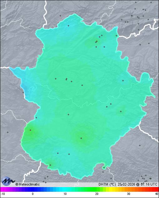 | Actualizado:24-02-2026 23:58 UTC | 9,7°C 85% | 25,6 °C / 95% | | 5,1°C / 29% | | Calma | | 17 km/h | | 1.020 hPa |