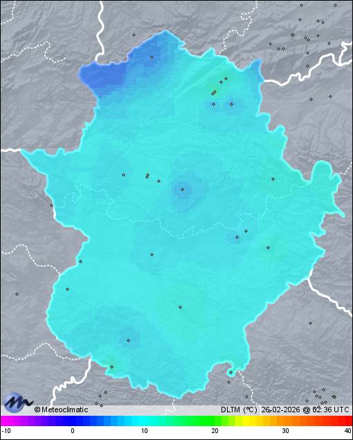 | Actualizado: 00:56 UTC | 7,7°C 94% | 9,4 °C / 94% |  | | 7,7°C / 92% | | Calma | | 5 km/h | | 1.021 hPa |