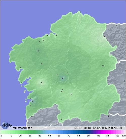 | Actualizado: 23:43 UTC | 10,9°C 81% | 12,5 °C / 89% | | 5,4°C / 76% | | 7 km/h SE | | 30 km/h | | 1.017 hPa | | 0,3 mm |