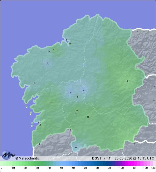 | Actualizado: 16:49 UTC | 18,8°C 49% | 19,9 °C / 75% | | 10,3°C / 45% | | 18 km/h E | | 43 km/h | | 1.028 hPa |