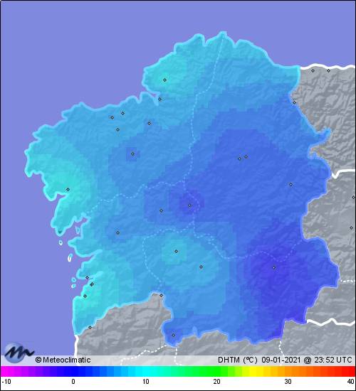 | 09-01-2021 | | | Máx. | Mín. | | | Temperatura | 7,4 | -2,1 | °C | | Humedad | 88 | 58 | % | | Viento | 41 | n/a | km/h | | Presión | 1.012 | 1.009 | hPa | | Precipitación | 0,0 | mm |