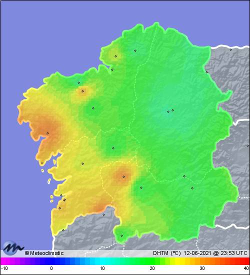 | 12-06-2021 | | | Máx. | Mín. | | | Temperatura | 22,3 | 12,9 | °C | | Humedad | 93 | 72 | % | | Viento | 35 | n/a | km/h | | Presión | 1.021 | 1.018 | hPa | | Precipitación | 0,0 | mm |