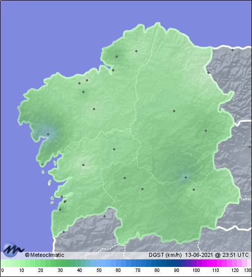 | 13-06-2021 | | | Máx. | Mín. | | | Temperatura | 32,3 | 17,3 | °C | | Humedad | 96 | 35 | % | | Viento | 68 | n/a | km/h | | Presión | 1.023 | 1.018 | hPa | | Precipitación | 19,0 | mm |