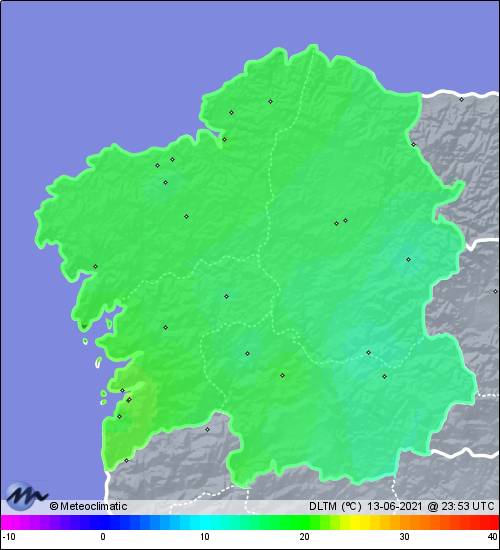 | 13-06-2021 | | | Máx. | Mín. | | | Temperatura | 29,1 | 18,7 | °C | | Humedad | 89 | 41 | % | | Viento | 41 | n/a | km/h | | Presión | 1.020 | 1.017 | hPa | | Precipitación | 1,6 | mm |