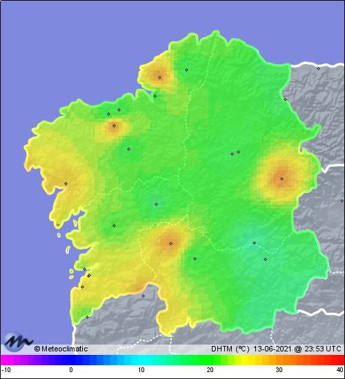 | 13-06-2021 | | | Máx. | Mín. | | | Temperatura | 32,3 | 17,3 | °C | | Humedad | 96 | 35 | % | | Viento | 68 | n/a | km/h | | Presión | 1.023 | 1.018 | hPa | | Precipitación | 19,0 | mm |