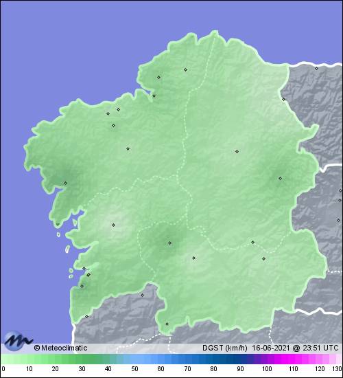| 16-06-2021 | | | Máx. | Mín. | | | Temperatura | 19,1 | 15,8 | °C | | Humedad | 98 | 88 | % | | Viento | 19 | n/a | km/h | | Presión | 1.014 | 1.010 | hPa | | Precipitación | 0,3 | mm |