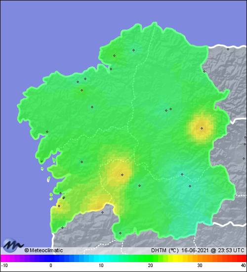 | 16-06-2021 | | | Máx. | Mín. | | | Temperatura | 26,1 | 19,4 | °C | | Humedad | 75 | 38 | % | | Viento | 30 | n/a | km/h | | Presión | 1.010 | 1.008 | hPa |