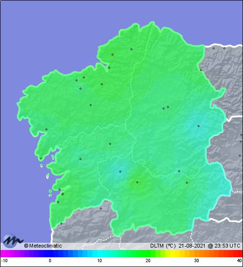| 21-08-2021 | | | Máx. | Mín. | | | Temperatura | 23,8 | 18,0 | °C | | Humedad | 92 | 76 | % | | Viento | 29 | n/a | km/h | | Presión | 1.023 | 1.017 | hPa | | Precipitación | 0,0 | mm |