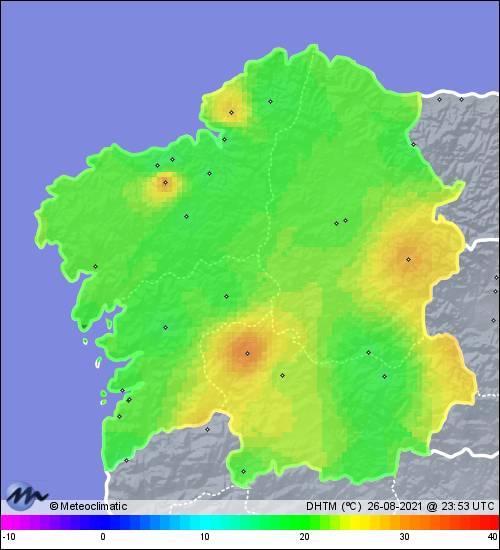 | 26-08-2021 | | | Máx. | Mín. | | | Temperatura | 25,7 | 13,4 | °C | | Humedad | 98 | 70 | % | | Viento | 19 | n/a | km/h | | Presión | 1.015 | 1.012 | hPa | | Precipitación | 0,0 | mm |
