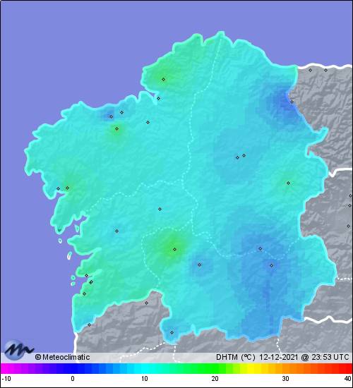 | 12-12-2021 | | | Máx. | Mín. | | | Temperatura | 13,6 | 5,8 | °C | | Humedad | 97 | 79 | % | | Viento | 11 | n/a | km/h | | Presión | 1.029 | 1.025 | hPa | | Precipitación | 0,0 | mm |