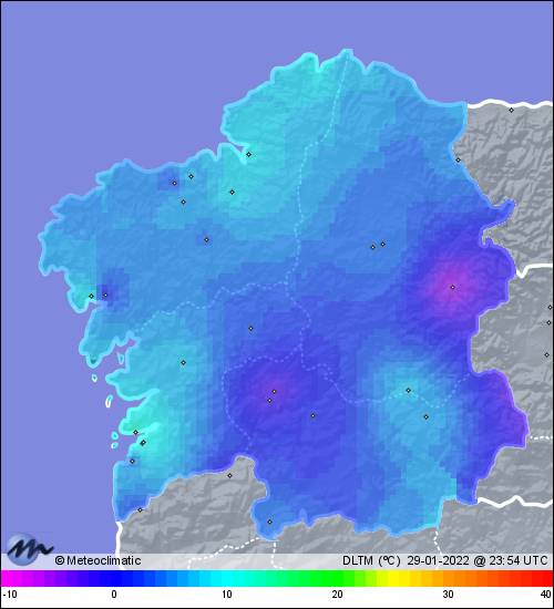 | 29-01-2022 | | | Máx. | Mín. | | | Temperatura | 12,5 | -1,5 | °C | | Humedad | 100 | 70 | % | | Presión | 1.038 | 1.034 | hPa | | Precipitación | 0,0 | mm |