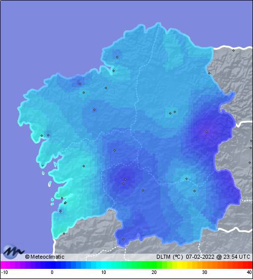 | 07-02-2022 | | | Máx. | Mín. | | | Temperatura | 13,0 | 4,0 | °C | | Humedad | 95 | 77 | % | | Viento | 28 | n/a | km/h | | Presión | 1.034 | 1.030 | hPa | | Precipitación | 0,0 | mm |