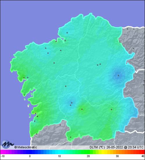 | 26-05-2022 | | | Máx. | Mín. | | | Temperatura | 26,5 | 12,6 | °C | | Humedad | 88 | 55 | % | | Viento | 21 | n/a | km/h | | Presión | 1.026 | 1.021 | hPa | | Precipitación | 0,0 | mm |