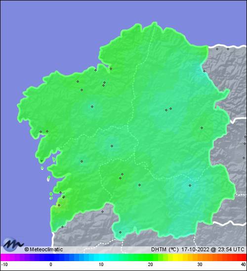 | 17-10-2022 | | | Máx. | Mín. | | | Temperatura | 19,3 | 14,1 | °C | | Humedad | 97 | 89 | % | | Viento | 21 | n/a | km/h | | Presión | 1.019 | 1.014 | hPa | | Precipitación | 1,0 | mm |