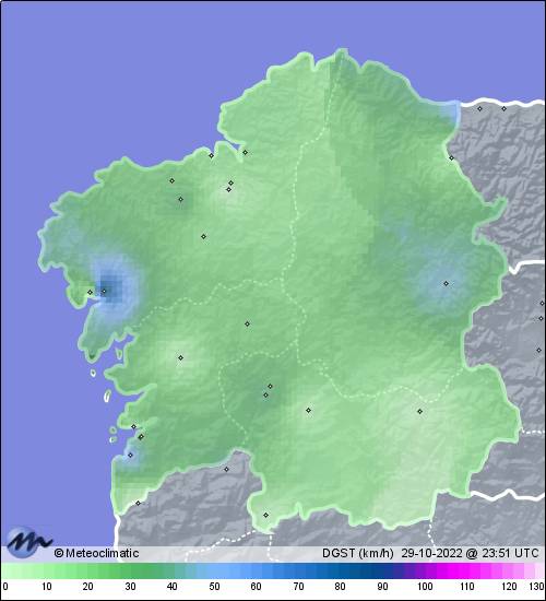 | 29-10-2022 | | | Máx. | Mín. | | | Temperatura | 18,7 | 13,7 | °C | | Humedad | 93 | 66 | % | | Viento | 37 | n/a | km/h | | Presión | 1.017 | 1.009 | hPa | | Precipitación | 28,6 | mm |