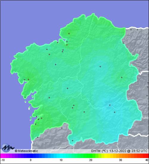 | 13-12-2022 | | | Máx. | Mín. | | | Temperatura | 17,4 | 14,3 | °C | | Humedad | 96 | 85 | % | | Viento | 23 | n/a | km/h | | Presión | 1.000 | 997 | hPa | | Precipitación | 1,6 | mm |