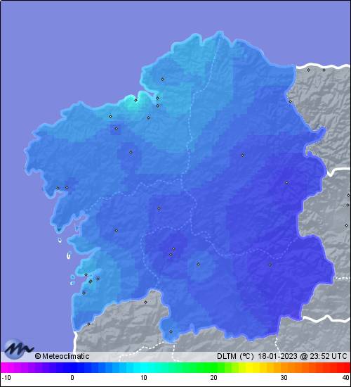 | 18-01-2023 | | | Máx. | Mín. | | | Temperatura | 8,4 | 2,4 | °C | | Humedad | 96 | 77 | % | | Presión | 1.025 | 1.007 | hPa | | Precipitación | 16,2 | mm |