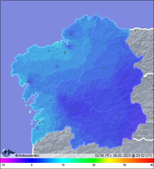 | 26-02-2023 | | | Máx. | Mín. | | | Temperatura | 12,6 | 4,8 | °C | | Humedad | 96 | 66 | % | | Viento | 44 | n/a | km/h | | Presión | 1.017 | 1.009 | hPa | | Precipitación | 0,0 | mm |