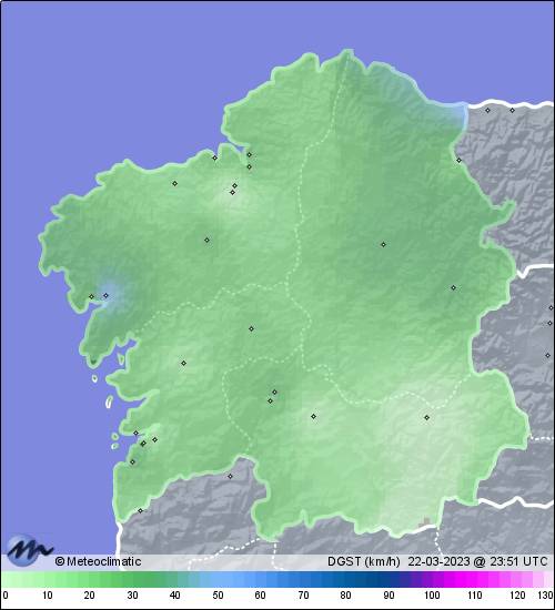 | 22-03-2023 | | | Máx. | Mín. | | | Temperatura | 15,4 | 11,6 | °C | | Humedad | 89 | 77 | % | | Viento | 50 | n/a | km/h | | Presión | 1.017 | 1.011 | hPa | | Precipitación | 0,0 | mm |