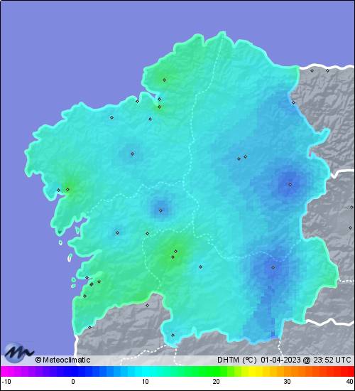 | 01-04-2023 | | | Máx. | Mín. | | | Temperatura | 15,9 | 7,6 | °C | | Humedad | 94 | 58 | % | | Presión | 1.030 | 1.025 | hPa | | Precipitación | 1,8 | mm |