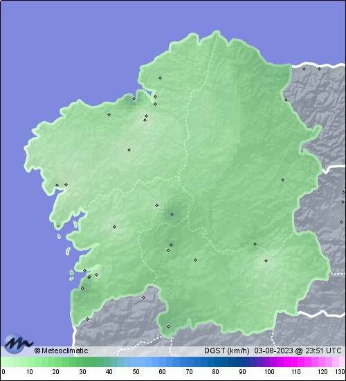 | 03-08-2023 | | | Máx. | Mín. | | | Temperatura | 19,2 | 8,4 | °C | | Humedad | 98 | 51 | % | | Viento | 33 | n/a | km/h | | Presión | 1.024 | 1.019 | hPa | | Precipitación | 0,0 | mm |
