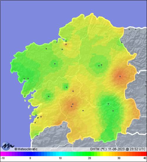 | 11-08-2023 | | | Máx. | Mín. | | | Temperatura | 25,3 | 19,8 | °C | | Humedad | 94 | 80 | % | | Viento | 23 | n/a | km/h | | Presión | 1.023 | 1.022 | hPa | | Precipitación | 0,0 | mm |
