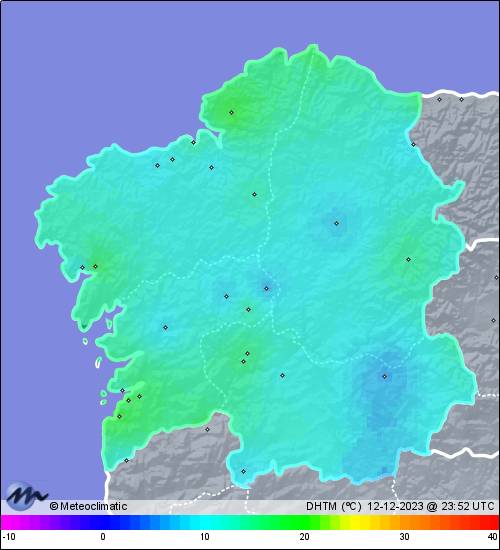 | 12-12-2023 | | | Máx. | Mín. | | | Temperatura | 18,2 | 13,0 | °C | | Humedad | 96 | 70 | % | | Viento | 32 | n/a | km/h | | Presión | 1.014 | 1.011 | hPa |