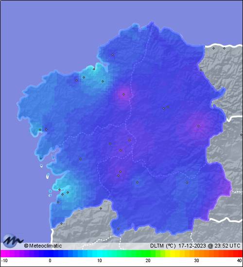 | 17-12-2023 | | | Máx. | Mín. | | | Temperatura | 9,5 | -4,1 | °C | | Humedad | 99 | 75 | % | | Viento | 8 | n/a | km/h | | Presión | 1.042 | 1.039 | hPa | | Precipitación | 0,2 | mm |